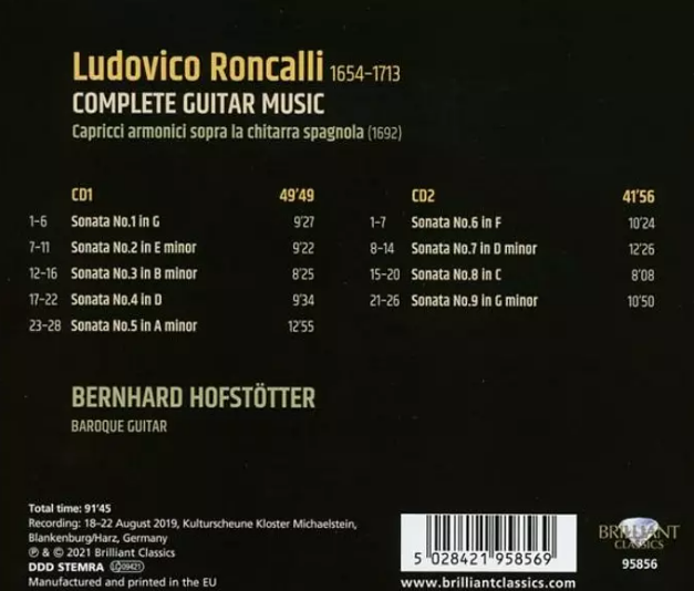 vorherigeMárquez/Schultsz, a joyful brotherhoodnächsteWiesauer, MonologuesHofstötter spielt Roncalli07.05.202111.06.2025Titel: Roncalli Complete Guitar MusicInterpret(en): Hofstötter, BernhardMedium: CDErscheinungsjahr: 2021Komponist(en): RoncalliLabel, Nr.: Brillant Classics 95856Instrument(e): Barockgitarreexterner Link: externer Link Bernhard Hofstötter RONCALLI COMPLETE GUITAR MUSIC – (CD) Bernhard Hofstötter auf CD online kaufen SA[…] Hofstötter RONCALLI COMPLETE GUITAR MUSIC – (CD) Bernhard Hofstötter auf CD online kaufen SA[…]